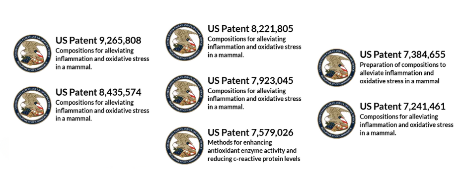vastgelegd in meerdere Amerikaanse patenten. Deze octrooien beschrijven onder andere formules en methoden om oxidatieve stress en ontstekingsprocessen bij zoogdieren te verminderen door het lichaamseigen antioxidantensysteem te activeren.